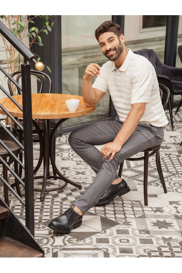 Spodnie EDWARD GREY ze wzorem plecionki to synonim elegancji w codziennym wydaniu. Idealnie pasuje do mokasynów, butów typu monki, chelsea czy broksy. To model typu slim spodni wizytowych ze średnim stanem o zwężanej nogawce, nadają sylwetce odpowiednie proporcje a dzięki dodatkowi elastanu są wygodne w noszeniu. Pasują do wielu marynarek i koszul dzięki czemu stworzysz wiele stylizacji. Spodnie w kolorze SZARYM.