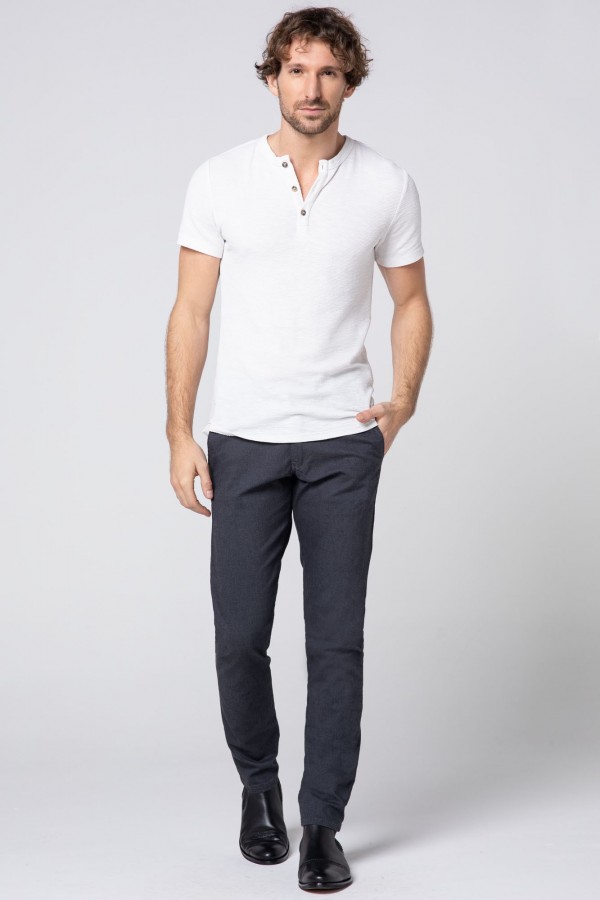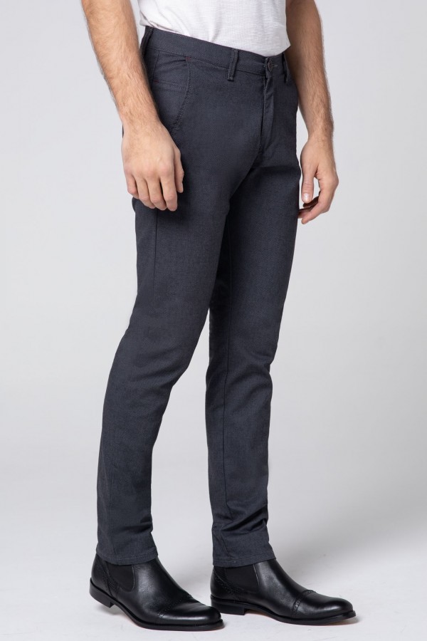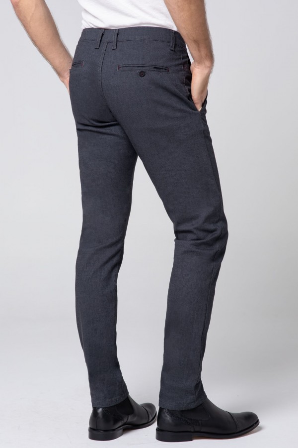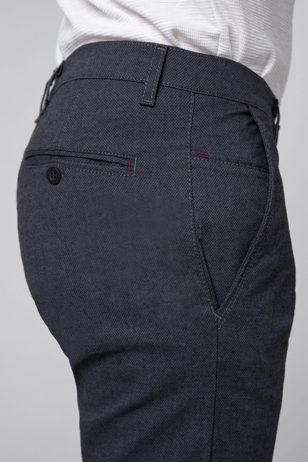 Te spodnie zapewnią każdemu panu modny i stylowy wygląd. To model typu slim spodni wizytowych ze średnim stanem o zwężanej nogawce, nadają sylwetce odpowiednie proporcje a dzięki dodatkowi elastanu są wygodne w noszeniu. Pasują do wielu marynarek i koszul zarówno gładkich jak i wzorzystych. Spodnie o ciekawej fakturze tkaniny.