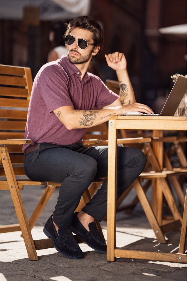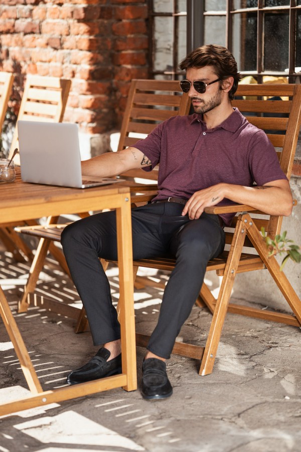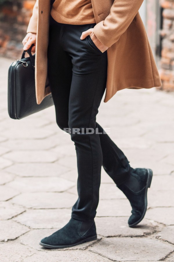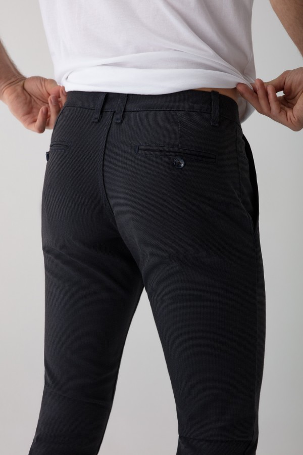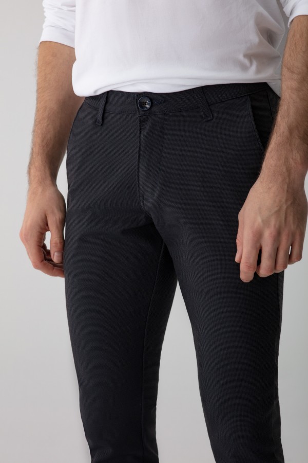 Te spodnie zapewnią każdemu panu modny i stylowy wygląd. To model typu slim spodni wizytowych ze średnim stanem o zwężanej nogawce, nadają sylwetce odpowiednie proporcje a dzięki dodatkowi elastanu są wygodne w noszeniu. Pasują do wielu marynarek i koszul zarówno gładkich jak i wzorzystych. Spodnie w kolorze granatowym o ciekawej fakturze tkaniny.